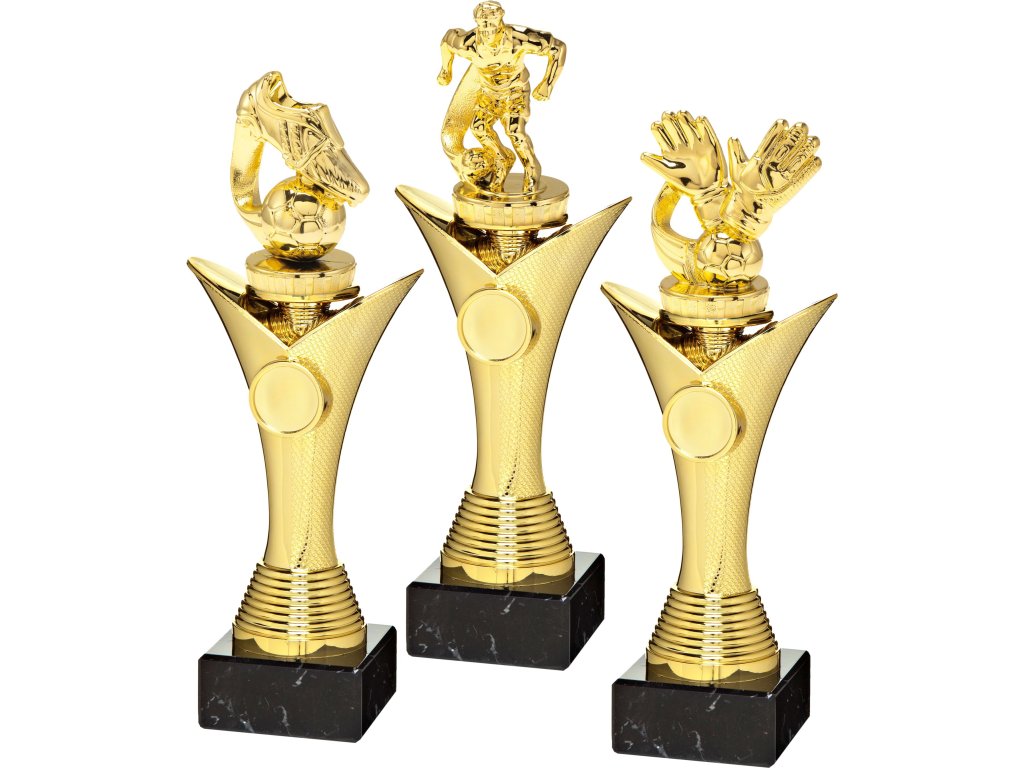 A labdarúgó trófeakészlet stílusos megjelenését a mérkőzések legjobbjainak díjazására szolgáló számok teremtették meg. A trófeák tökéletes választás a legjobb futballisták (játékos, kapus és gólszerző) díjazására. A talapzatra egy 25 mm átmérőjű gravírozott lemez és embléma helyezhető - nem tartozék (25 mm-es emblémák kiválasztása a menüben)