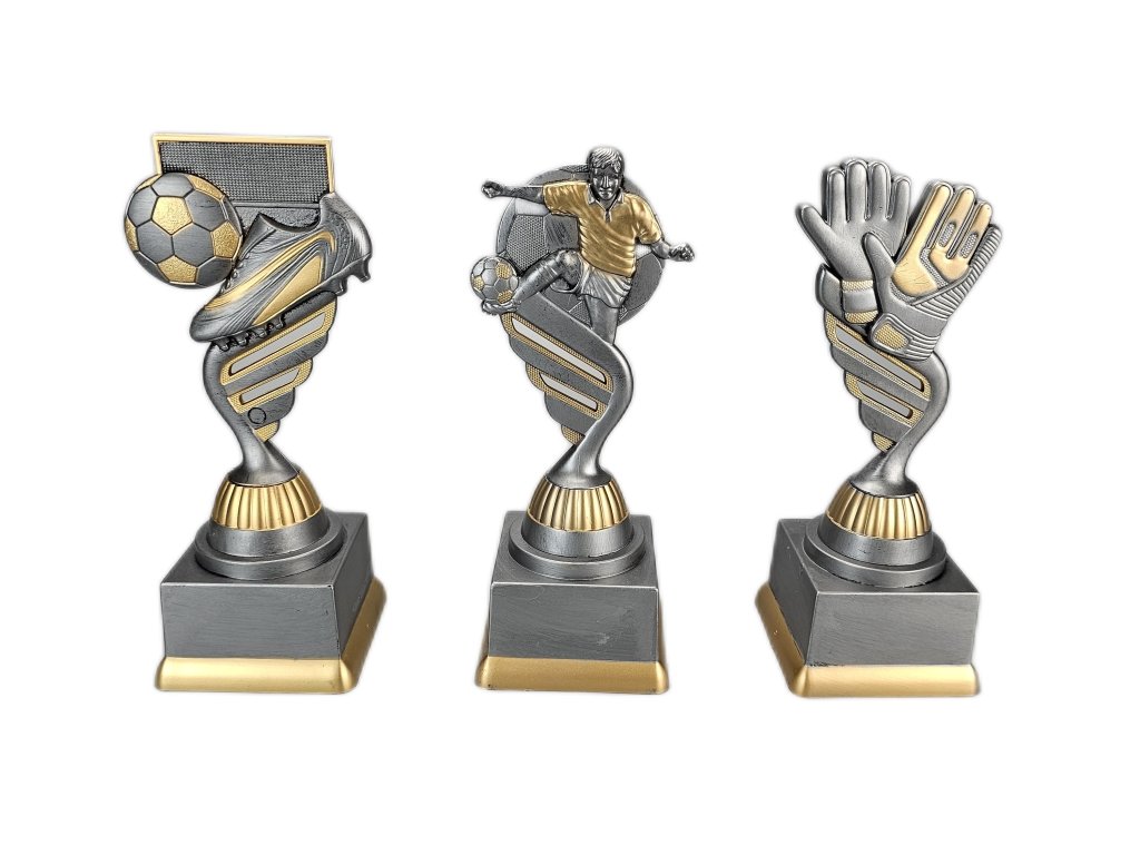 Stílus trófeakészlet futballmotívummal (kapus, játékos, kapus), az alapra gravírozott tábla elhelyezésének lehetőségével. A trófea kiváló választás a legjobb futballisták díjazására.