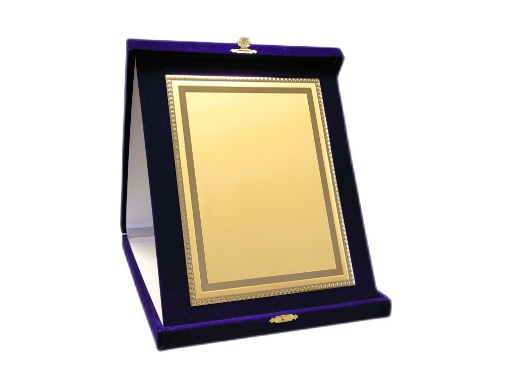 Az elegáns plakett egy kék bársony portréorientált dobozban van elhelyezve. A szublimációs hordozó egy dekoratív lap, amely arany csillogású, oldalain tükrös részletekkel. A plakett kialakítása miatt ideális választás különböző típusú társadalmi eseményekre, különleges sporteseményekre stb. Az ár tartalmazza a szublimálást.
