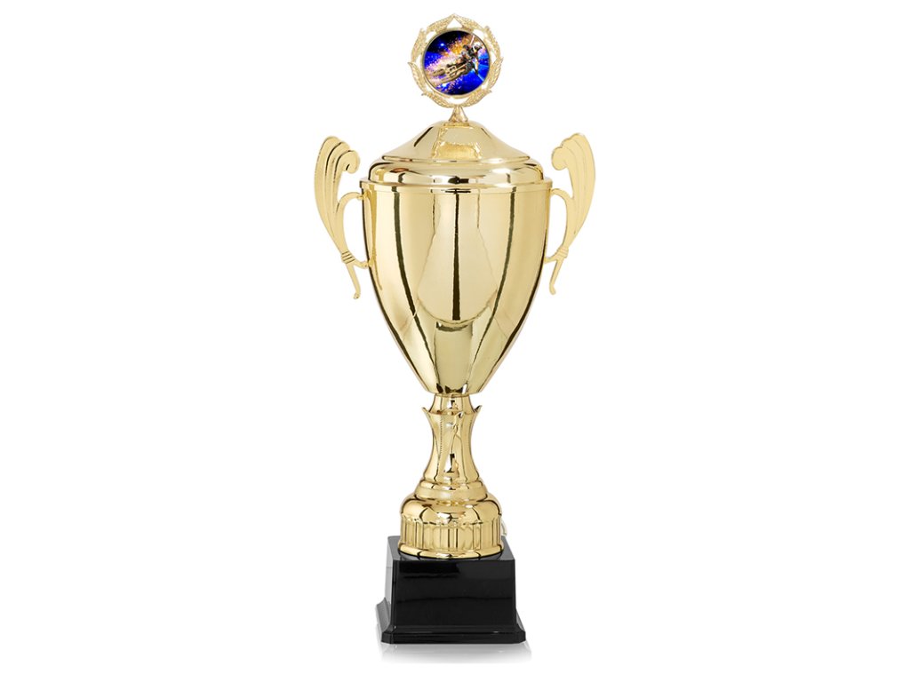 A pohár elegáns megjelenését egy műanyag talapzaton álló aranyszínű, füllel ellátott kehely adja, amelyet egy céltáblával ellátott fedél egészít ki, amelyre egy embléma (50 mm) helyezhető. A fedél nincs szilárdan rögzítve a csészéhez, és eltávolítható. Ideális választás minden sportághoz, és kiegészíthető az alapra helyezett gravírozott címkével. 4 méretben kapható változat a díjazottak sorrendjének fokozatos leosztásához.