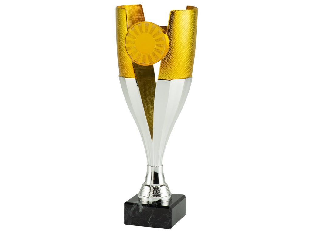 Egyedi kupa ezüstkék kivitelben, érdekes részletekkel a kehelyen, márványalapra helyezve. A trófea kiegészíthető egy 25 mm átmérőjű emblémával (nem tartozék) és egy gravírozott címkével, amely az alapra kerül. A díjazottak sorrendjének osztályozásához 3 változat áll rendelkezésre.