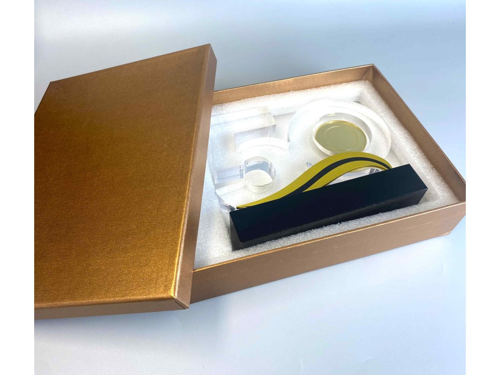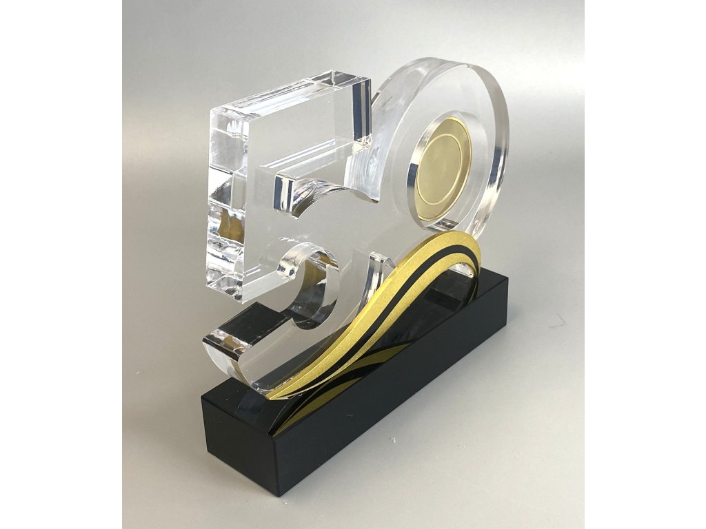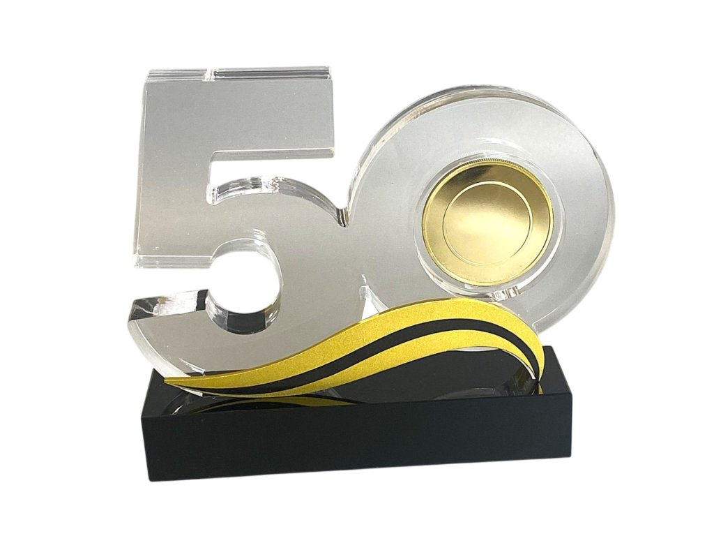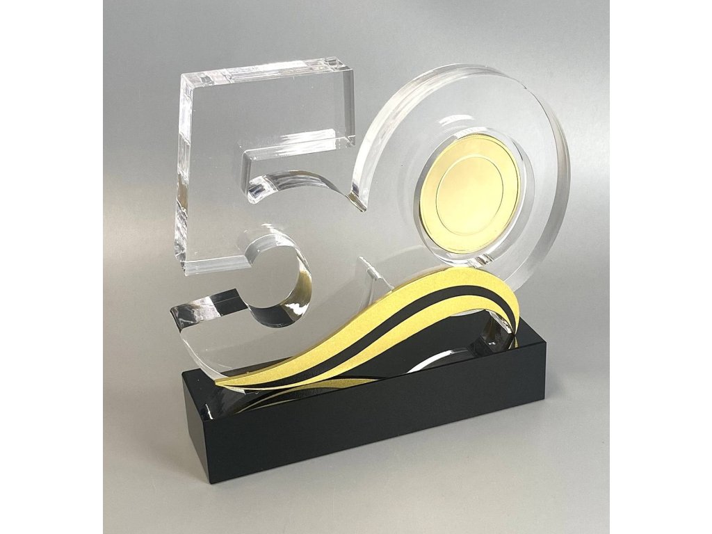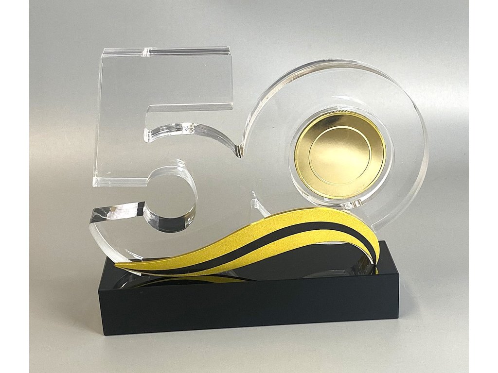 Stílusos akril jubileumi pohár aranyszínű részletekkel az alapon, elegáns kivitelben, különösen alkalmas a jubilánsok számára, logó/szöveg hozzáadásának lehetőségével egy fémérmén, valamint egy gravírozott lemezzel az alapon. . A pohár kialakítása ideális választás különböző típusú társadalmi eseményekhez, különleges sporteseményekhez stb.