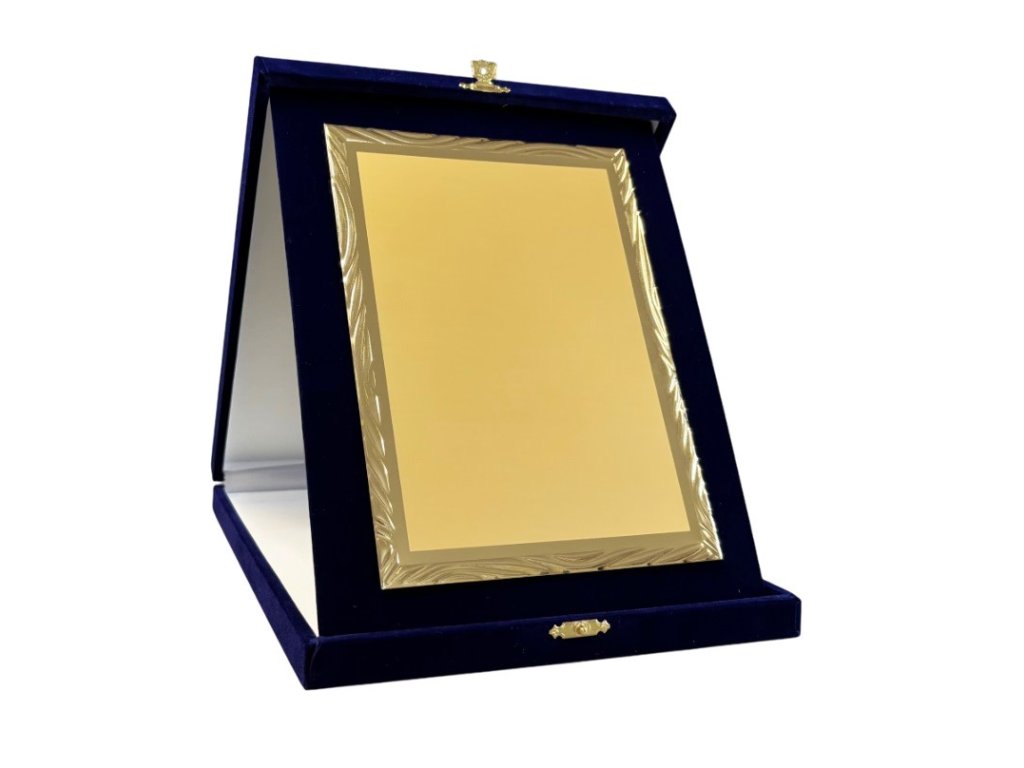 Az elegáns plakett egy kék bársony portréorientált dobozban van elhelyezve. A szublimációs hordozó egy dekoratív lap, amely arany csillogású, oldalain tükrös részletekkel. A plakett kialakítása miatt ideális választás különböző típusú társadalmi eseményekre, különleges sporteseményekre stb. Az ár tartalmazza a szublimálást.