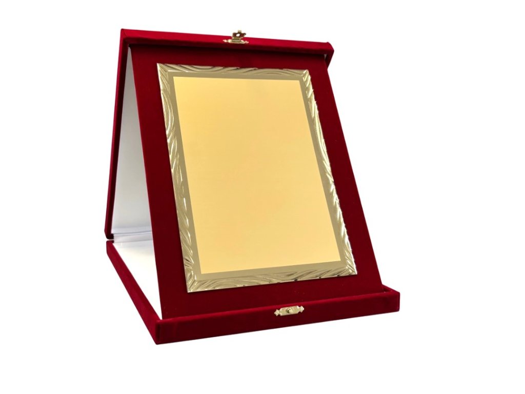 Az elegáns plakett egy vörös bársony portré orientációs dobozban van elhelyezve. A szublimációs hátlap egy dekoratív lap, amely arany csillogású, oldalain tükörrel díszített részletekkel. A plakett kialakítása miatt ideális választás különböző típusú társadalmi eseményekre, különleges sporteseményekre stb. Az ár tartalmazza a szublimálást.