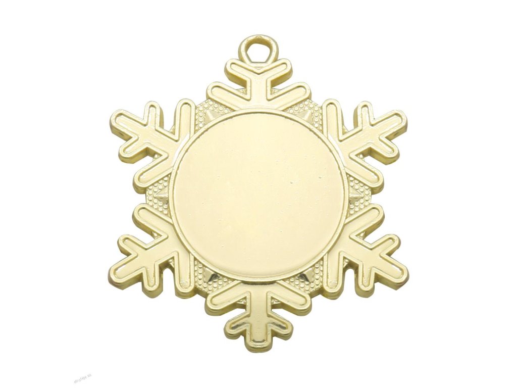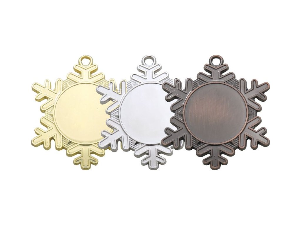 Metál érem hópehely motívummal, arany, ezüst vagy bronz kivitelben szalagra akasztható (az Ön választása szerint). Az előlapon lehetőség van saját embléma elhelyezésére vagy a kínálatból ( 25 mm átmérőjű). Az érem hátoldalán lehetőség van grafika/szöveg elhelyezésére (átmérő 35mm).