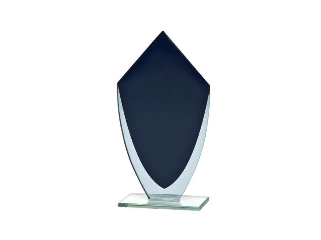 Elegáns tükrös trófea kék háttérrel, üveg alapon, az üvegre gravírozási lehetőséggel. A trófea kialakítása miatt ideális választás különböző típusú társadalmi eseményekre, különleges sporteseményekre stb.