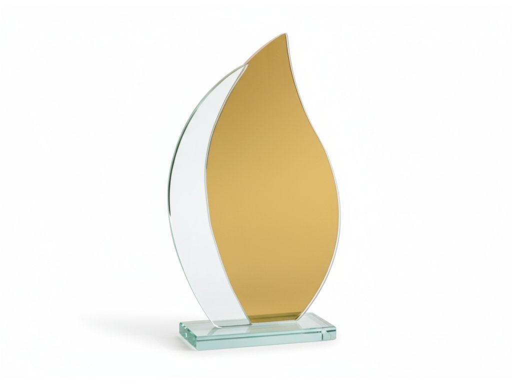 Stílusos üveg trófea arany háttérrel, az üvegre történő gravírozás lehetőségével. Az üveg kialakításnak köszönhetően ideális választás különböző típusú társadalmi eseményekhez, különleges sporteseményekhez stb.