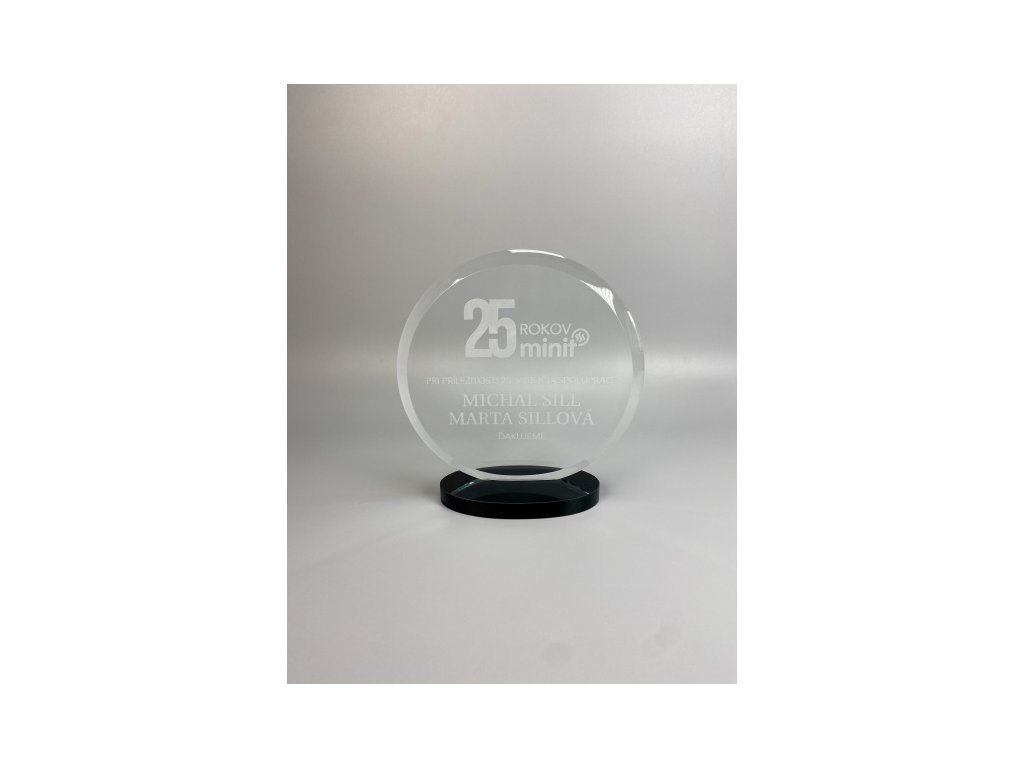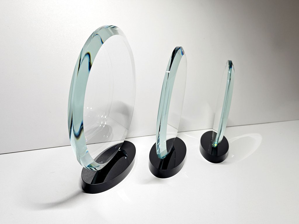 Egyedi formájú, fekete üveg talapzattal ellátott, elegáns trófea, amelybe gravírozás is készíthető. Az üveg kialakításnak köszönhetően ideális választás különböző típusú társadalmi eseményekhez, különleges sporteseményekhez stb.