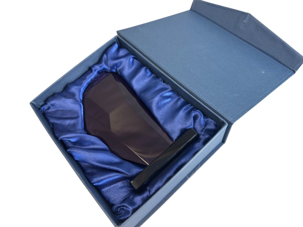 Előkelő lila üvegplakett talapzaton, az üvegre történő gravírozás lehetőségével. Az üveges kialakításnak köszönhetően ideális választás különböző típusú társadalmi eseményekre, különleges sporteseményekre stb.
