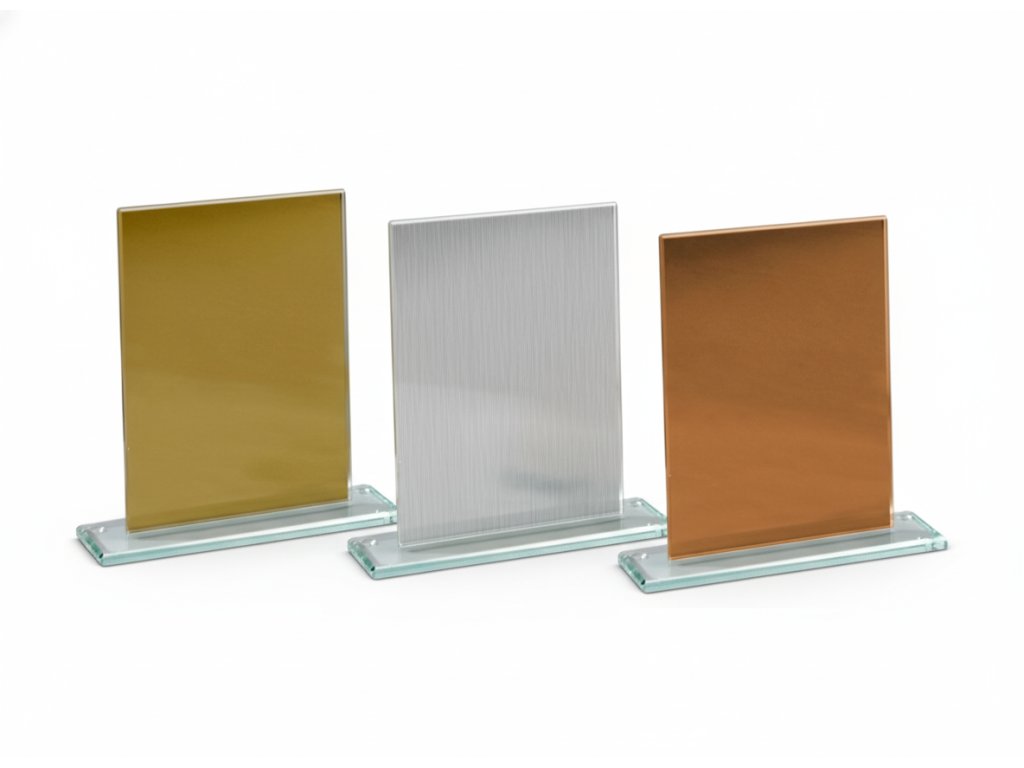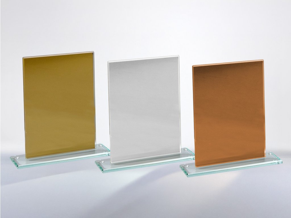 Stílusos üveg trófea tükrözött arany, ezüst és bronz háttérrel, az üvegre történő gravírozás lehetőségével. Az üveg kialakítás ideális választás különféle társadalmi eseményekhez, különleges sporteseményekhez stb.