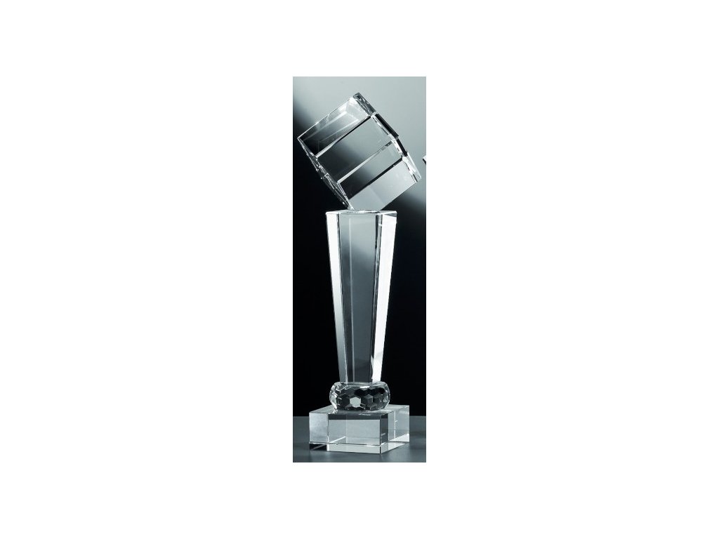 Elegáns üvegtrófea, melynek tetején egy átlátszó kocka van elhelyezve, az üvegre gravírozási lehetőséggel. Az üveg kialakításnak köszönhetően ideális választás különböző típusú társadalmi eseményekre, különleges sporteseményekre stb.
