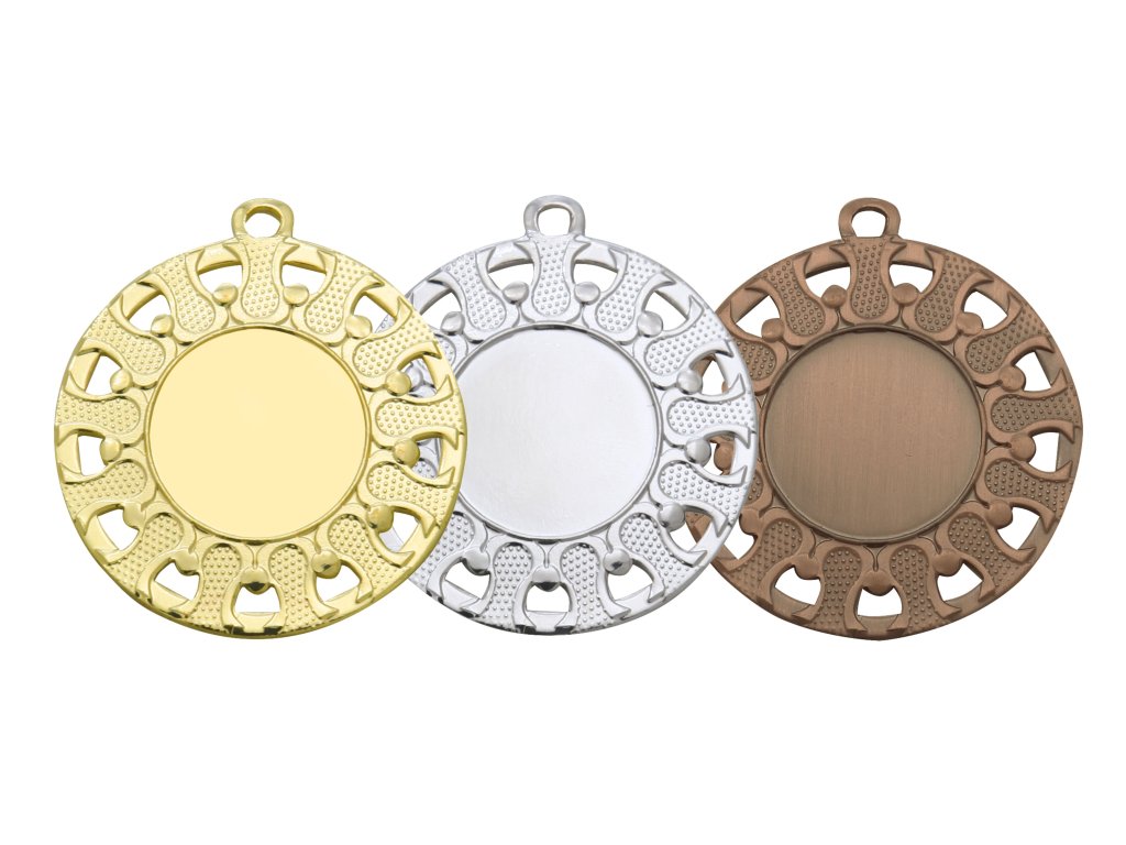 Metál érem arany, ezüst vagy bronz kivitelben szalagra akasztható (az Ön választása szerint). Az előlapon lehetőség van saját embléma elhelyezésére vagy a kínálatból ( 25 mm átmérőjű). Az érem hátoldalán lehetőség van grafika/szöveg elhelyezésére (átmérő 35mm).