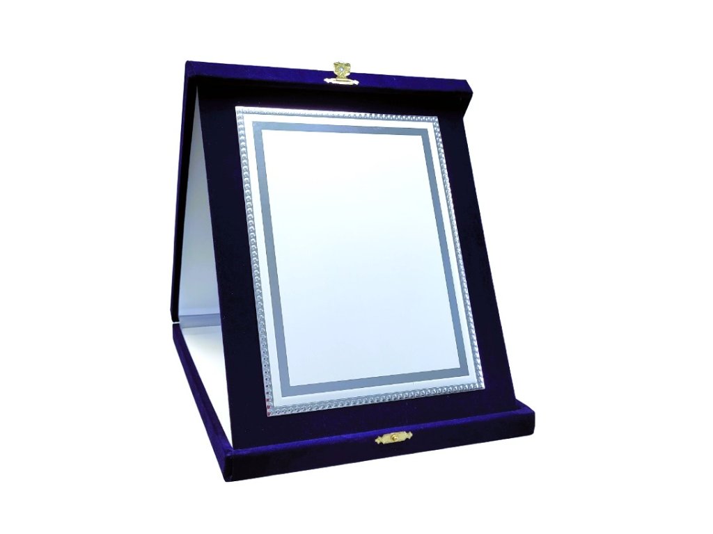 Az elegáns plakett egy kék bársony portréorientált dobozban van elhelyezve. A szublimációs hátlap egy dekoratív lap, amely ezüstös csillogású, oldalain tükrös részletekkel. A plakett kialakítása miatt ideális választás különböző típusú társadalmi eseményekre, különleges sporteseményekre stb. Az ár tartalmazza a szublimálást.