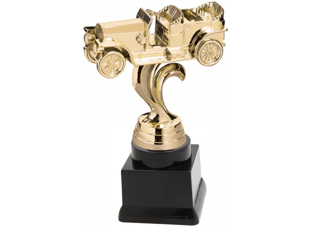 Egy stílusos arany figura veterán motívummal, műanyag talapzaton, melyre gravírozott tábla is elhelyezhető.
