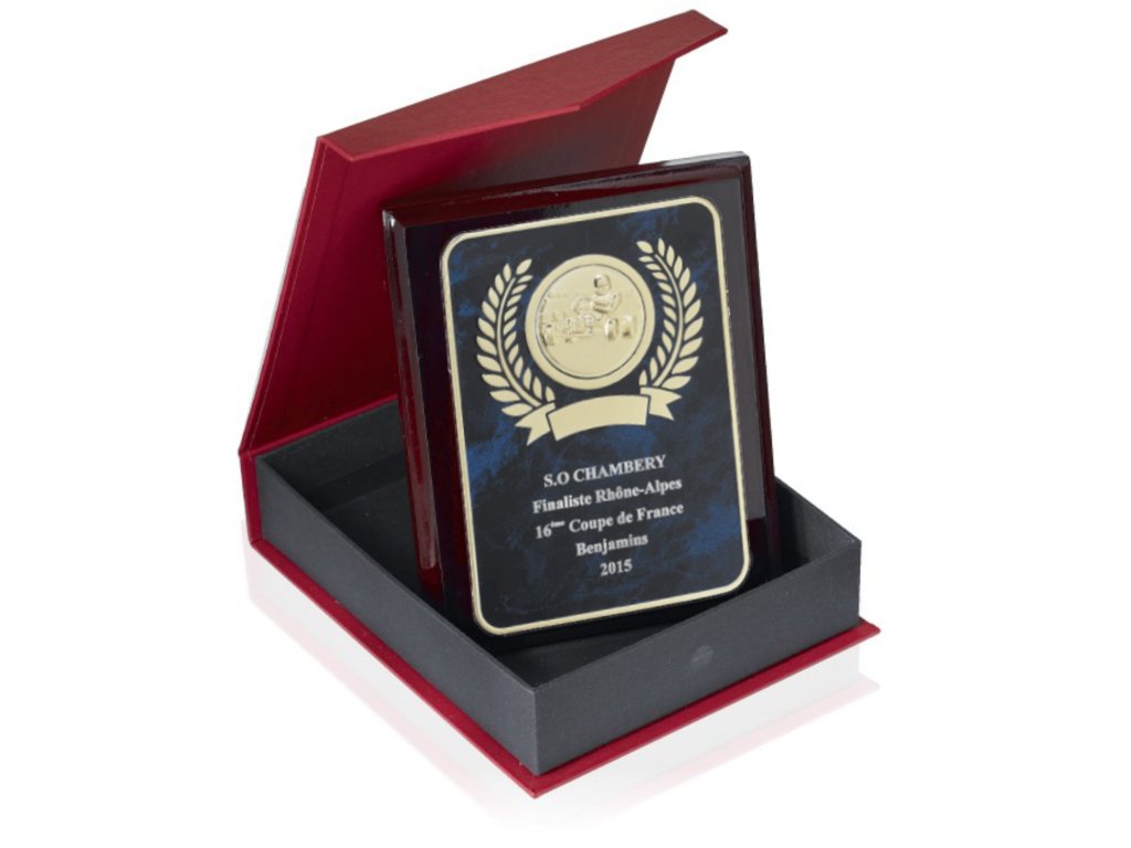 Elegáns fa plakett mahagóni árnyékolóval, embléma hozzáadásának lehetőségével ( 50mm átmérőjű), díszdobozban tárolva. Gravírozott díszlemezzel, amely egy fából készült talapzatra van helyezve. A plakett kialakítása miatt ideális választás különböző típusú társadalmi eseményekhez, különleges sporteseményekhez stb.