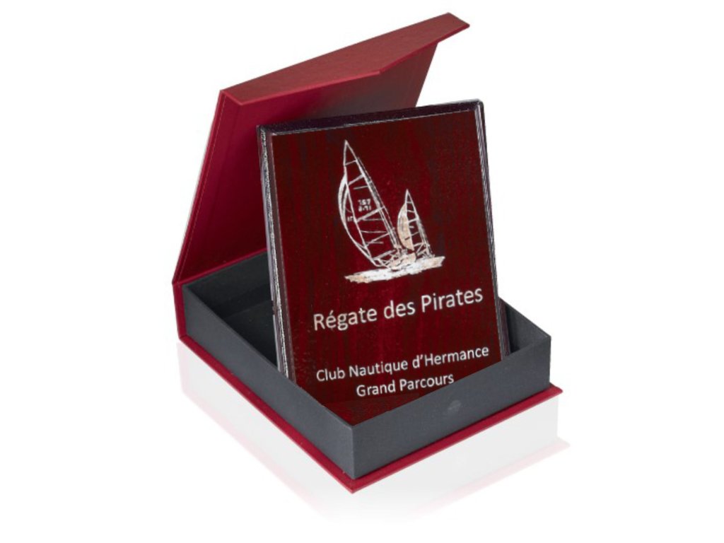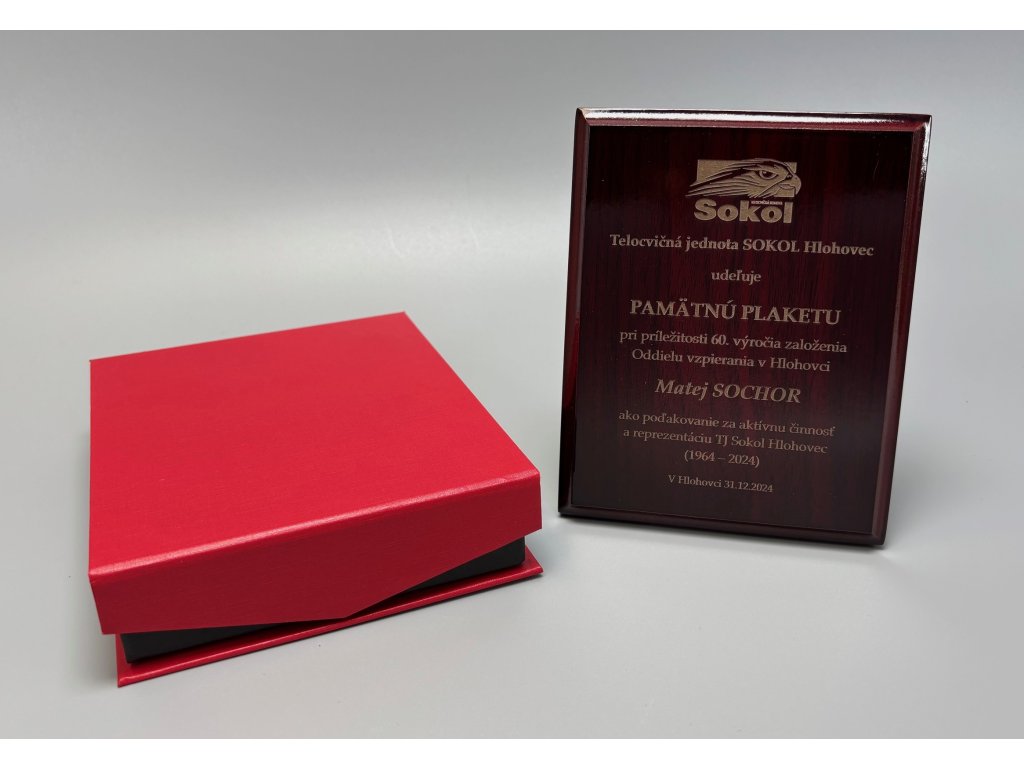 Elegáns fa emléktábla mahagóni árnyékolóval, díszes dobozban elhelyezve, fába vésési lehetőséggel. A plakett kialakítása miatt ideális választás különböző típusú társadalmi eseményekhez, különleges sporteseményekhez stb.