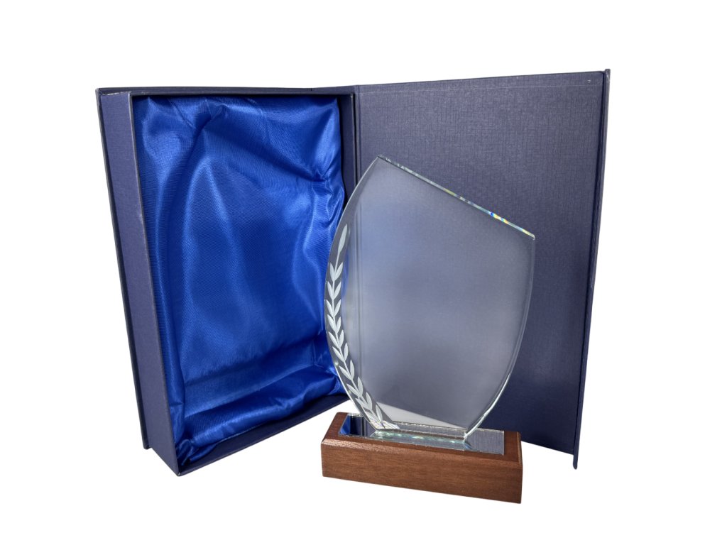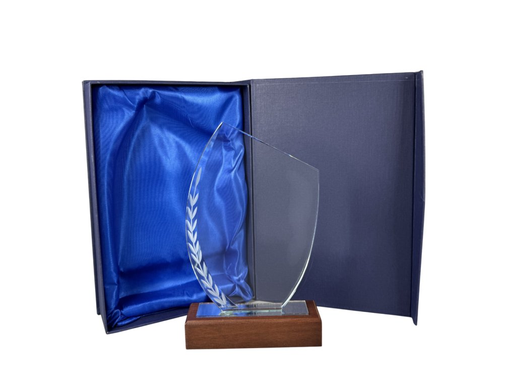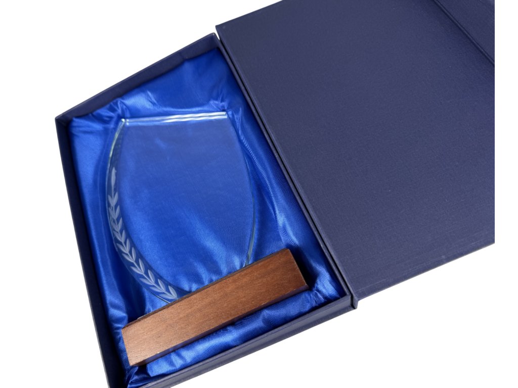 Stílusos üveg fa alapon, fazettált élekkel, előre gravírozott babérkoszorúval, az üvegre gravírozás lehetőségével. A pohár kialakítása ideális választás különféle társasági eseményekhez, különleges sporteseményekhez stb.