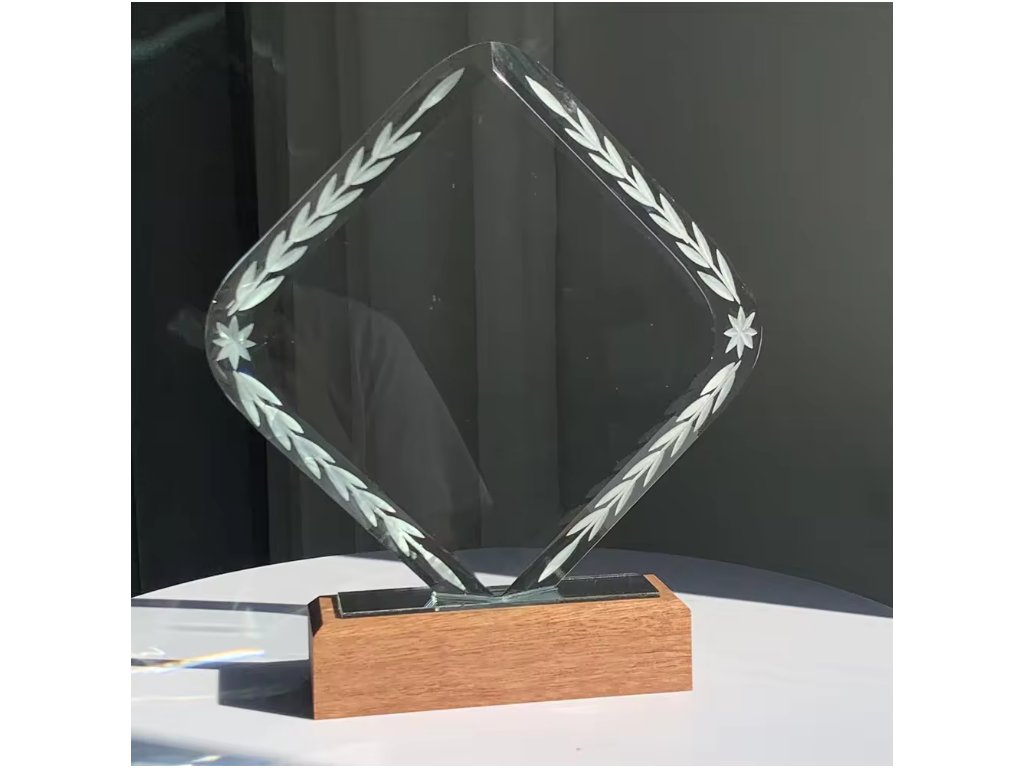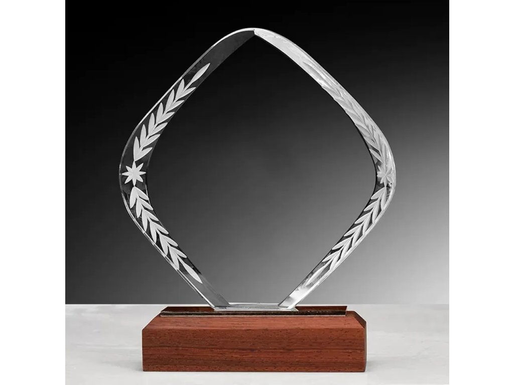 Stílusos üveg fa alapon, fazettált élekkel, előre gravírozott babérkoszorúval, az üvegre gravírozás lehetőségével. A pohár kialakítása ideális választás különféle társasági eseményekhez, különleges sporteseményekhez stb.