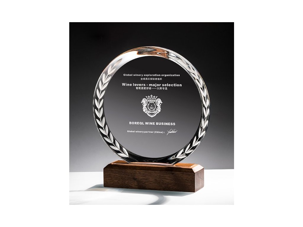 Stílusos üveg fa alapon, fazettált élekkel, előre gravírozott babérkoszorúval, az üvegre gravírozás lehetőségével. A pohár kialakítása ideális választás különféle társasági eseményekhez, különleges sporteseményekhez stb.