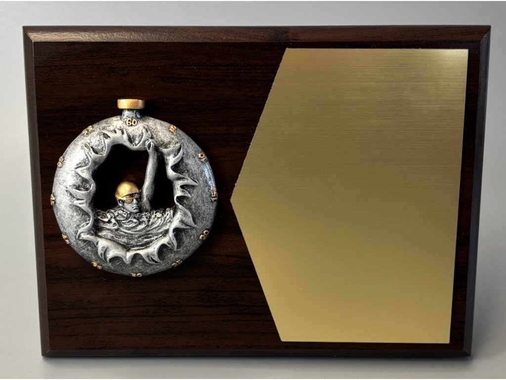 Elegáns, sötét fából készült emléktábla 3D-s úszó figurával és gravírozott tábla opcióval. A tábla állványra akasztható/állványra helyezhető.A tábla kialakítása miatt ideális választás különböző típusú társadalmi eseményekre, különleges sporteseményekre stb. Az ár tartalmazza a gravírozást.