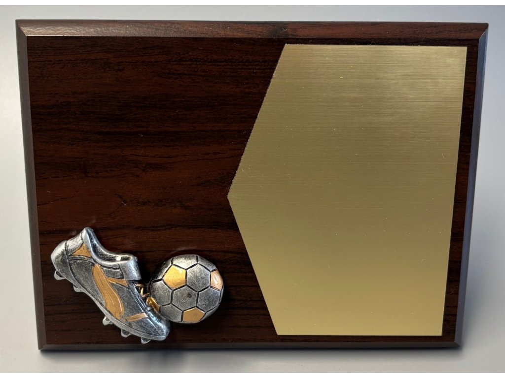 Elegáns, sötét fából készült emléktábla 3D-s futballfigurával és gravírozott tábla opcióval. A plakett állványra akasztható/állványra helyezhető.A plakett kialakítása miatt ideális választás különböző típusú társadalmi eseményekre, különleges sporteseményekre stb. Az ár tartalmazza a gravírozást.