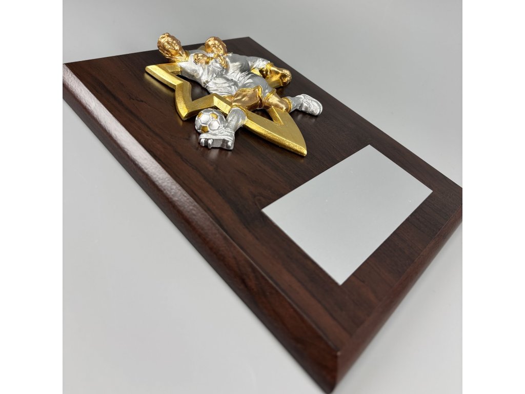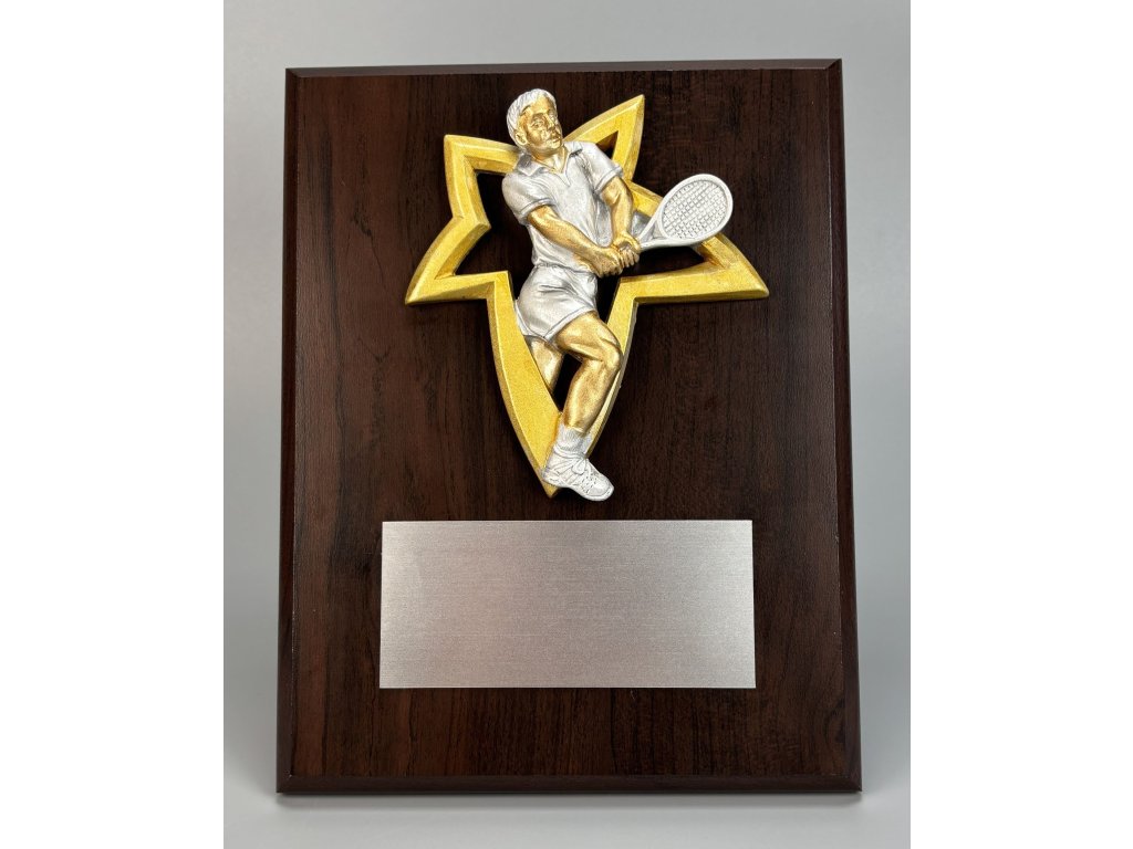 Elegáns, sötét fából készült emléktábla 3D teniszfigurával és gravírozott táblával. A tábla állványra akasztható/állványra helyezhető.A tábla kialakítása miatt ideális választás különböző típusú társadalmi eseményekre, különleges sporteseményekre stb. Az ár tartalmazza a gravírozást.