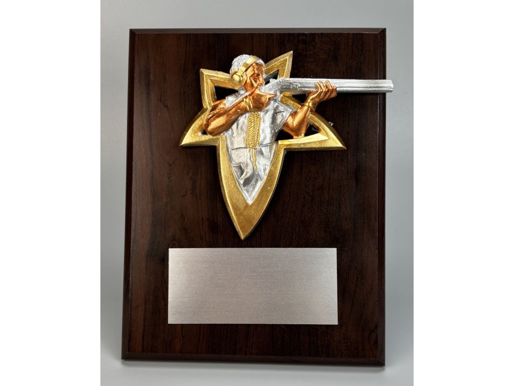 Elegáns, sötét fából készült emléktábla 3D-s lövészfigurával és gravírozott táblával. A plakett állványra akasztható/állványra helyezhető.A plakett kialakítása miatt ideális választás különböző típusú társadalmi eseményekre, különleges sporteseményekre stb. Az ár tartalmazza a gravírozást.