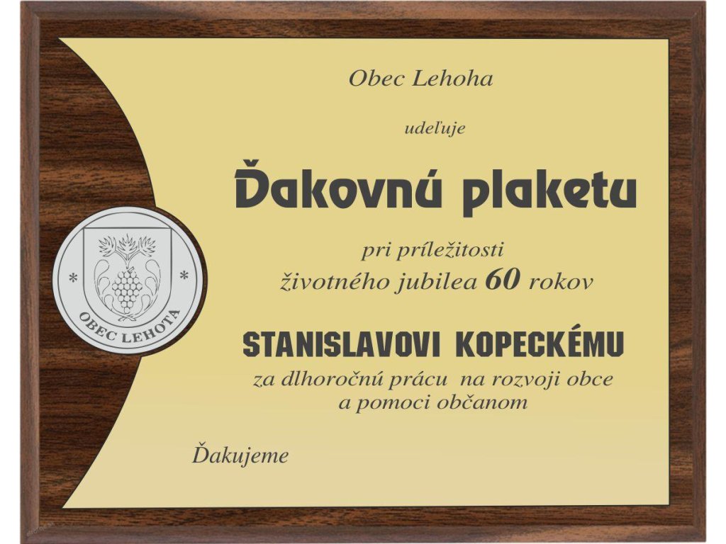 A stílusos fa emléktábla akasztási lehetőséggel, sötét árnyalatú fából készült. A gravírozás alapja egy dekoratív műanyag, amely arany vagy ezüst csillogású (lehetőség a megjegyzésben megadható a megrendeléskor).A plakett a részletekre és a dizájnra való odafigyeléssel készült, ami egyedi jelleget kölcsönöz a megjelenésének.A plakett kialakítása ideális választás különböző típusú társadalmi eseményekhez, különleges sporteseményekhez stb. Az ár tartalmazza a gravírozást.
