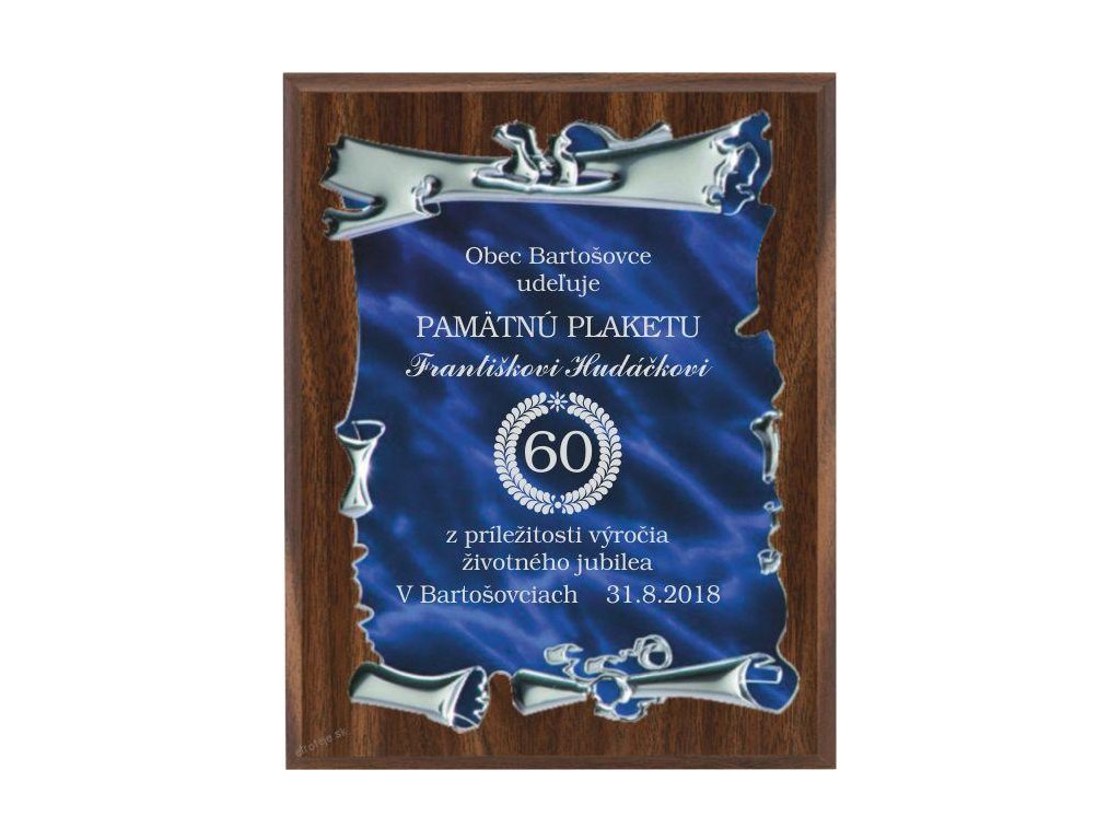 Elegáns, sötét árnyalatú fából készült emléktábla, amely felakasztható/állványra helyezhető. Arany csillogású, dekoratív fémre van gravírozva, enyhe 3D-s kék papirusz hatású.A plakett a részletekre és a dizájnra való odafigyeléssel készült, ami egyedi jelleget kölcsönöz a megjelenésének.A plakett kialakítása miatt ideális választás különböző típusú társadalmi eseményekhez, különleges sporteseményekhez stb. Az ár tartalmazza a gravírozást is.