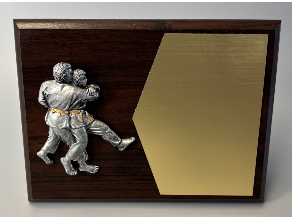 Elegáns, sötét fából készült emléktábla 3D dzsúdó figurával és gravírozott táblával. A plakett állványra akasztható/állványra helyezhető.A plakett kialakítása miatt ideális választás különböző típusú társadalmi eseményekre, különleges sporteseményekre stb. Az ár tartalmazza a gravírozást.