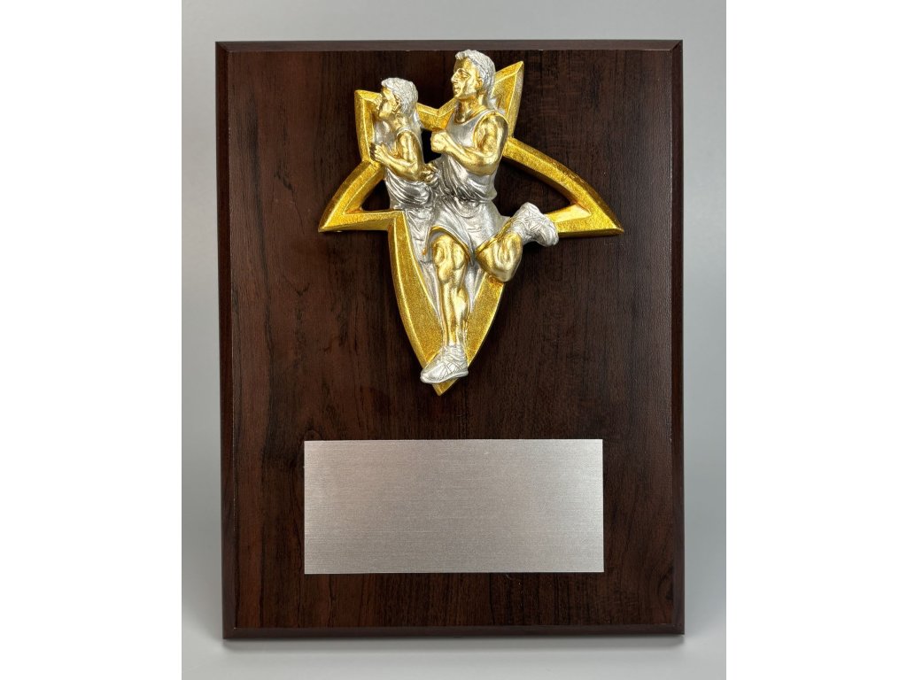 Elegáns, sötét fából készült emléktábla 3D-s futófigurával és gravírozott tábla opcióval. A plakett állványra akasztható/állványra helyezhető.A plakett kialakítása miatt ideális választás különböző típusú társadalmi eseményekre, különleges sporteseményekre stb. Az ár tartalmazza a gravírozást.