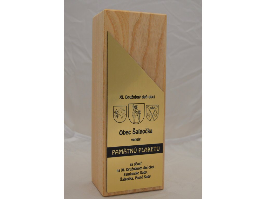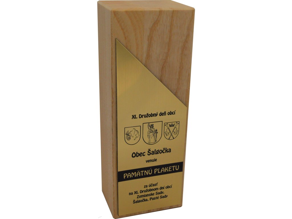 Egyedi fa emléktábla, amelybe a fára vagy a hozzáerősített díszítő műanyagra (mellékletben) gravírozható, tömör fából készült, világos árnyalatú, finom fa textúrával. A gravírozás hordozója dekoratív műanyag, amely arany, ezüst vagy bronz színben kapható (lehetőség a megrendelési megjegyzésben megadható), vagy közvetlenül a fába gravírozható.A plakett a részletekre és a formatervezésre való odafigyeléssel készült, ami egyedi jelleget kölcsönöz megjelenésének.A plakett kialakítása miatt ideális választás különböző típusú társadalmi eseményekre, különleges sporteseményekre stb.