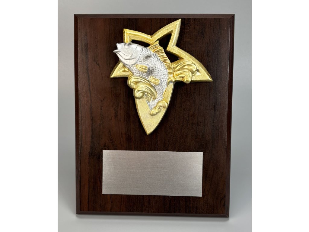 Elegáns, sötét fából készült emléktábla 3D-s halfigurával és gravírozott lemezzel. A plakett állványra akasztható/állványra helyezhető.A plakett kialakítása miatt ideális választás különböző típusú társadalmi eseményekre, különleges sporteseményekre stb. Az ár tartalmazza a gravírozást.