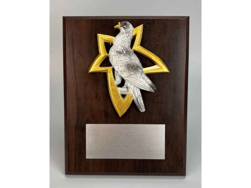 Elegáns, sötét fából készült emléktábla 3D-s galambfigurával és gravírozott tábla opcióval. A plakett állványra akasztható/állványra helyezhető.A plakett kialakítása miatt ideális választás különböző típusú társadalmi eseményekre, különleges sporteseményekre stb. Az ár tartalmazza a gravírozást.