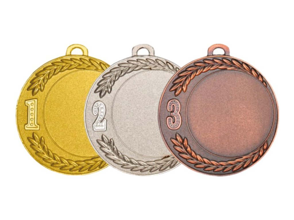Metál elhelyezési érem arany, ezüst vagy bronz színben szalagra akasztható (az Ön választása szerint). Az előlapon lehetőség van saját embléma elhelyezésére vagy a menüből ( 50mm átmérőjű). Az érem hátoldalán lehetőség van grafika/szöveg elhelyezésére (átmérő 60mm).