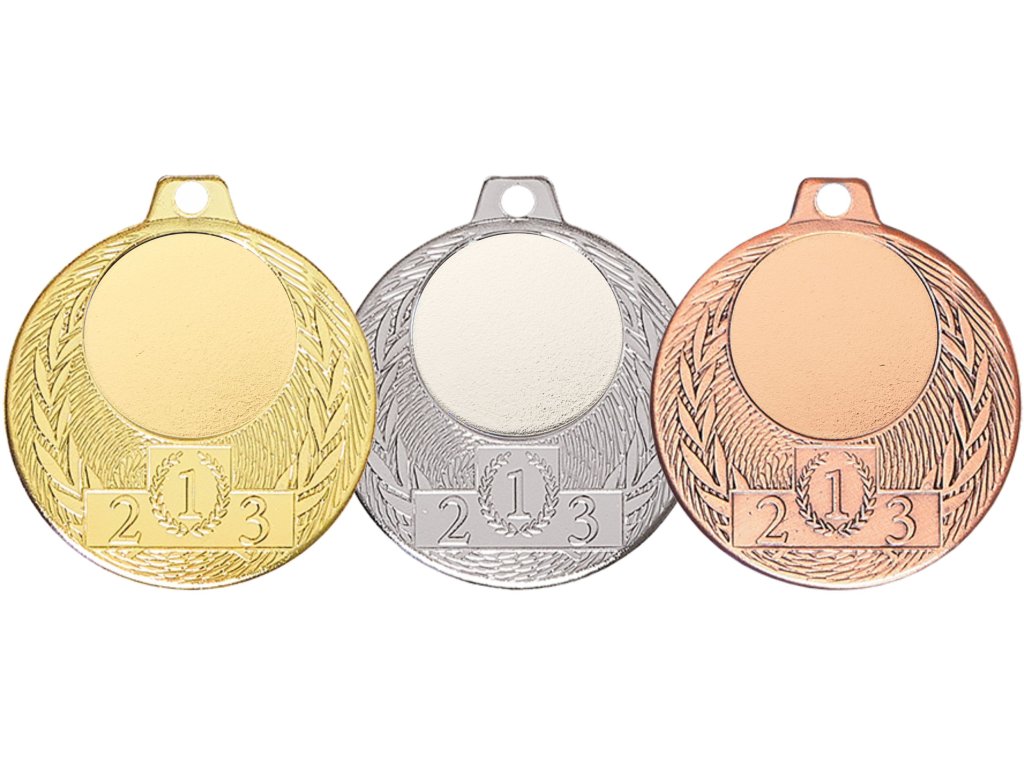 Metál érem arany, ezüst vagy bronz kivitelben szalagra akasztható (az Ön választása szerint). Az előlapon lehetőség van saját embléma elhelyezésére vagy a kínálatból ( 25 mm átmérőjű). Az érem hátoldalán lehetőség van grafika/szöveg elhelyezésére (átmérő 40mm).