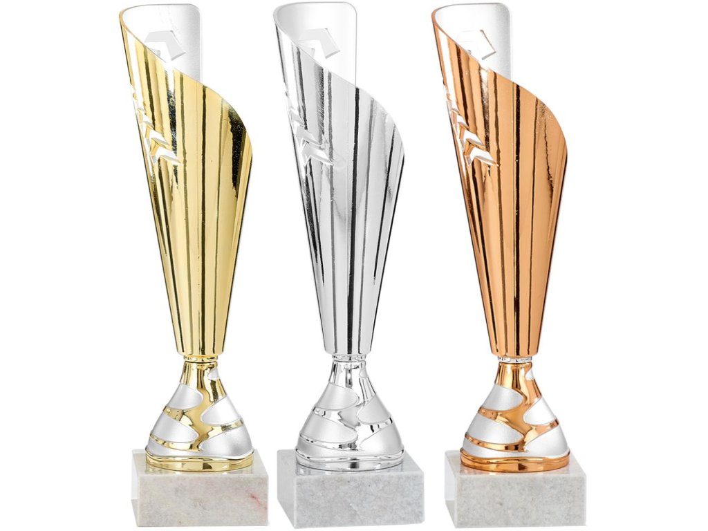 Egyedi serleg aranyból, ezüstből vagy bronzból, érdekes részletekkel a kehelyen, márványalapra helyezve. A trófea kiegészíthető egy gravírozott címkével, amely az alapra kerül. A díjazottak sorrendjének osztályozásához 3 színváltozat áll rendelkezésre.