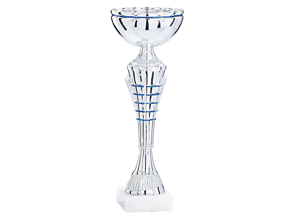 Egy stílusos ezüst serleg kehellyel, amely kék részletekkel díszített, vonzó száron áll, és márvány alapra van helyezve. Ideális választás minden sportághoz, és a talapzatra helyezett gravírozott tábla lehetőségét is magában foglalja. 3 méretben kapható változat a díjazottak sorrendjének lefokozásához.