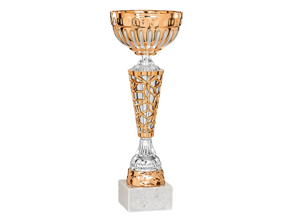 A pohár stílusos megjelenését a márvány talapzatra helyezett, narancssárga részletekkel díszített, finoman díszített kehely adja. Ideális választás minden sporttípushoz, és kiegészül a talapzaton elhelyezett gravírozott címke opcióval.