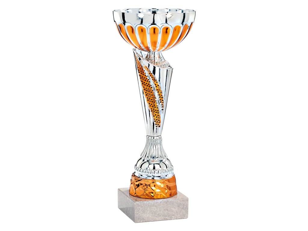A pohár stílusos megjelenését a márvány talapzatra helyezett, narancssárga részletekkel díszített, finoman díszített kehely adja. Ideális választás minden sportághoz, és kiegészül a talapzaton elhelyezett gravírozott tányér lehetőségével. 3 méretben kapható változat a díjazottak sorrendjének lefokozásához.