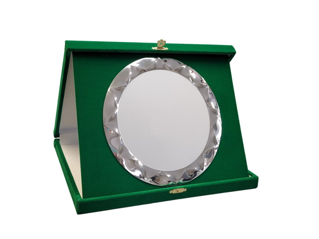 Az elegáns plakett egy zöld bársony tájoló dobozban van elhelyezve. A szublimációs hátlap egy dekoratív lap, amely ezüstös csillogású, oldalain tükrös részletekkel. A plakett kialakítása ideális választás különböző típusú társadalmi eseményekhez, különleges sporteseményekhez stb. Az ár tartalmazza a szublimálást.
