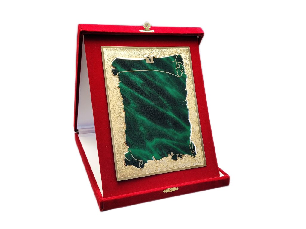 Az elegáns emléktábla egy vörös bársony portré-orientált dobozban található. Díszes fémre van gravírozva arany csillogással, enyhe 3D-s zöld papiruszhatással. A plakett a részletekre és a dizájnra való odafigyeléssel készült, ami egyedi jelleget kölcsönöz megjelenésének. A plakett kialakítása miatt ideális választás különböző típusú társadalmi eseményekre, különleges sporteseményekre stb. Az ár tartalmazza a gravírozást.