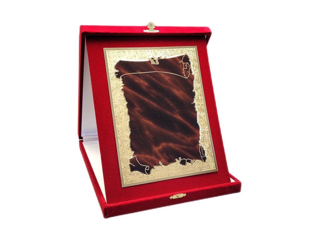 Az elegáns emléktábla egy vörös bársony portré-orientált dobozban található. Díszes fémre van gravírozva arany csillogással, enyhe 3D-s barna papirusz hatású. A plakett a részletekre és a dizájnra való odafigyeléssel készült, ami egyedi jelleget kölcsönöz megjelenésének. A plakett kialakítása miatt ideális választás különböző típusú társadalmi eseményekhez, különleges sporteseményekhez stb. Az ár tartalmazza a gravírozást.
