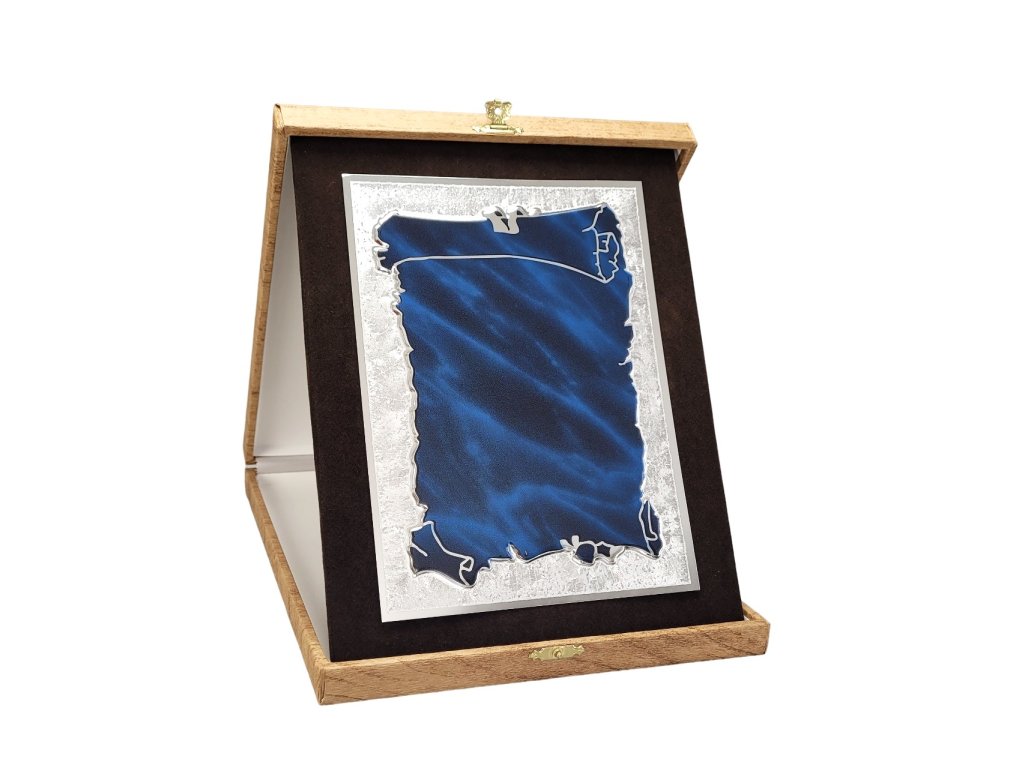 Az elegáns emléktábla egy barna, portréképes dobozban van elhelyezve. Díszes fémre van gravírozva ezüstös csillogással, enyhe 3D-s kék papiruszhatással. A plakett a részletekre és a dizájnra való odafigyeléssel készült, ami egyedi jelleget kölcsönöz megjelenésének. A plakett kialakítása miatt ideális választás különböző típusú társadalmi eseményekhez, különleges sporteseményekhez stb. Az ár tartalmazza a gravírozást.