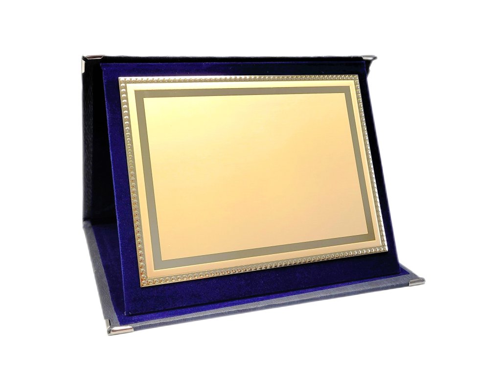 Elegáns plakett egy szürke és kék SLIM dobozban. A szublimációs hordozó egy dekoratív lap, amely arany csillogású, oldalain tükrös részletekkel. A plakett kialakítása miatt ideális választás különböző típusú társadalmi eseményekre, különleges sporteseményekre stb. Az ár tartalmazza a szublimációt.