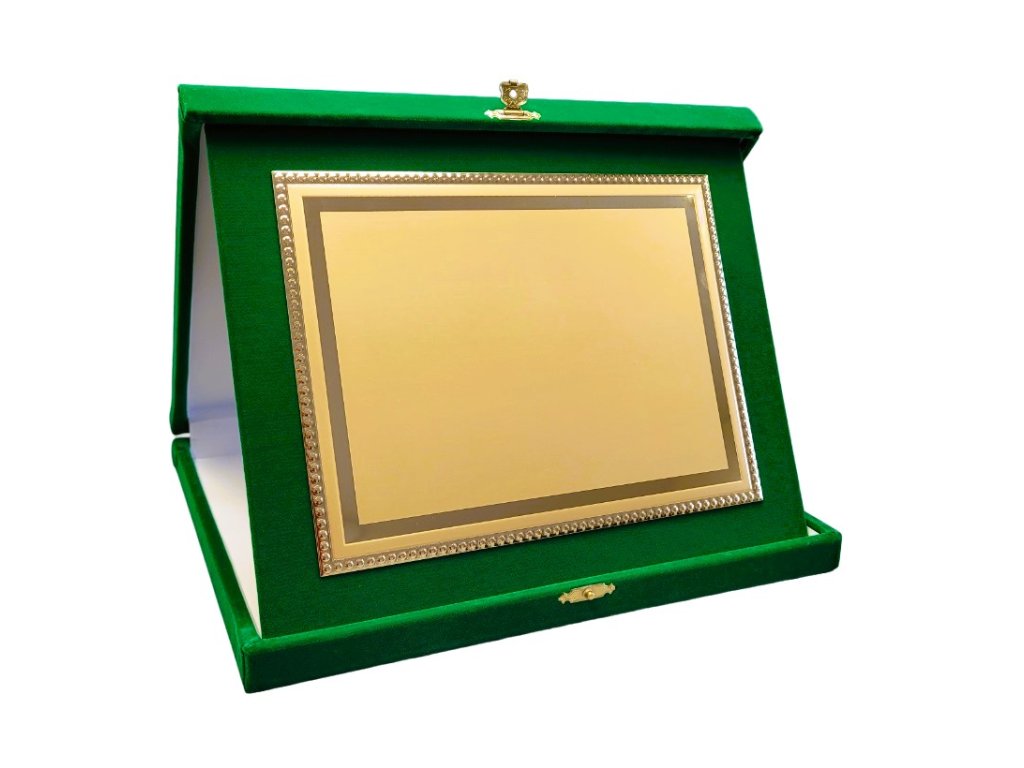 Az elegáns plakett egy zöld bársony tájoló dobozban van elhelyezve. A szublimációs hordozó egy dekoratív lap, amely arany csillogású, oldalain tükrös részletekkel. A plakett kialakítása miatt ideális választás különböző típusú társadalmi eseményekre, különleges sporteseményekre stb. Az ár tartalmazza a szublimálást.