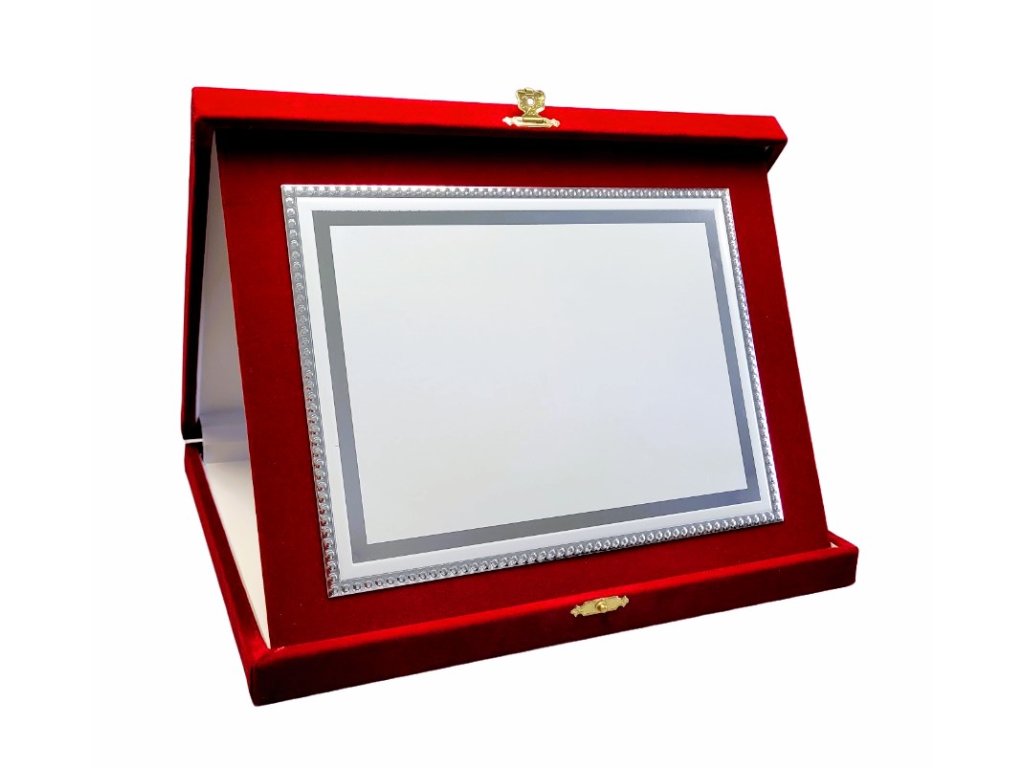 Az elegáns emléktábla egy vörös bársony, tájképi tájolású dobozban van elhelyezve. A szublimációs hátlap egy dekoratív lap, amely ezüstös fényű, oldalain tükrös részletekkel. A plakett kialakítása miatt ideális választás különböző típusú társadalmi eseményekre, különleges sporteseményekre stb. Az ár tartalmazza a szublimálást.