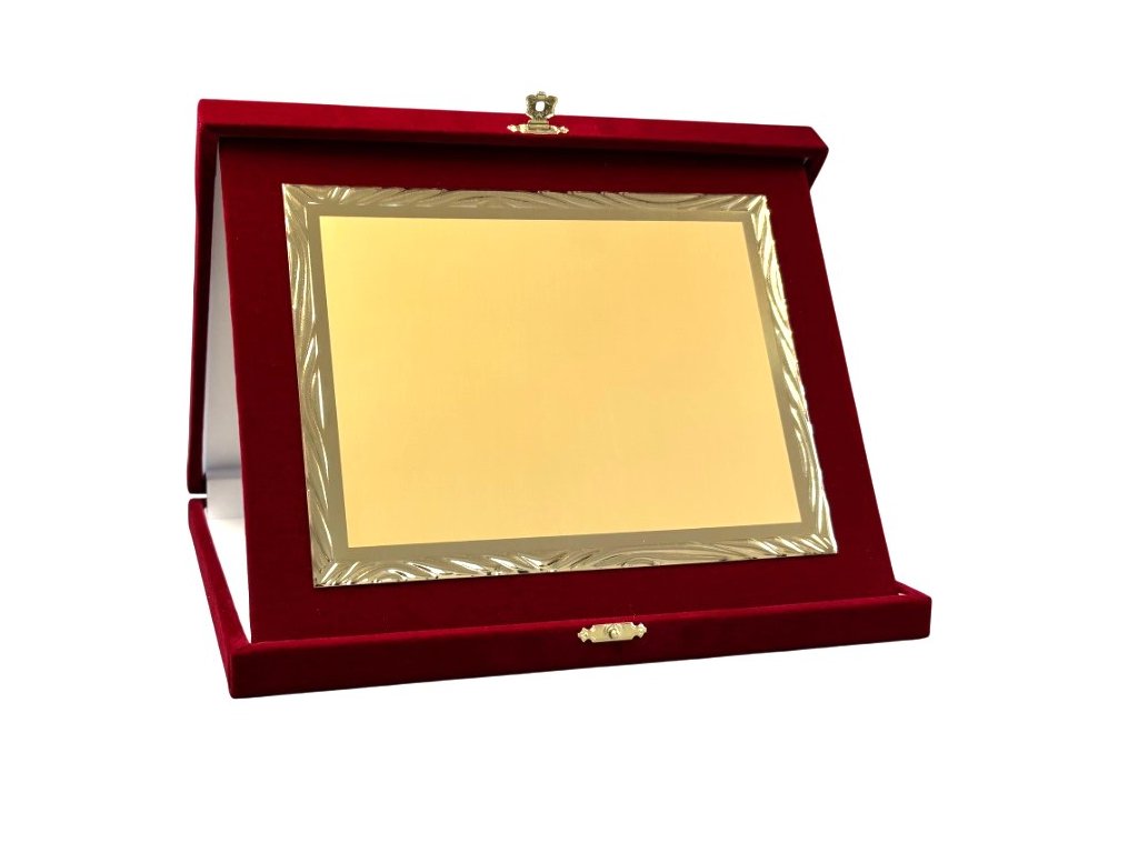 Az elegáns emléktábla egy vörös bársony, tájképi tájolású dobozban van elhelyezve. A szublimációs hordozó egy dekoratív lap, amely arany csillogású, oldalain tükrös részletekkel. A plakett kialakítása miatt ideális választás különböző típusú társadalmi eseményekre, különleges sporteseményekre stb. Az ár tartalmazza a szublimálást.