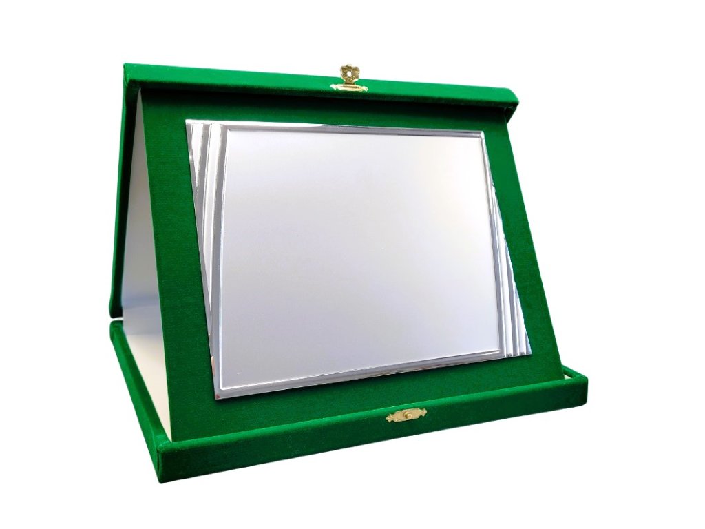 Az elegáns plakett egy zöld bársony tájoló dobozban van elhelyezve. A szublimációs hátlap egy dekoratív lap, amely ezüstös fényű, oldalain tükrös részletekkel. A plakett kialakítása ideális választás különböző típusú társadalmi eseményekhez, különleges sporteseményekhez stb. Az ár tartalmazza a szublimálást.