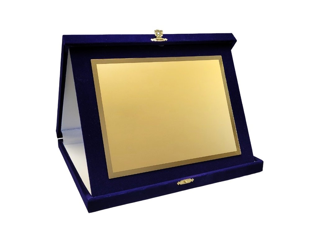 Az elegáns plakett egy kék bársony tájoló dobozban van elhelyezve. A szublimációs hordozó egy dekoratív lap, amely arany csillogású, oldalain tükrös részletekkel. A plakett kialakítása miatt ideális választás különböző típusú társadalmi eseményekre, különleges sporteseményekre stb. Az ár tartalmazza a szublimálást.